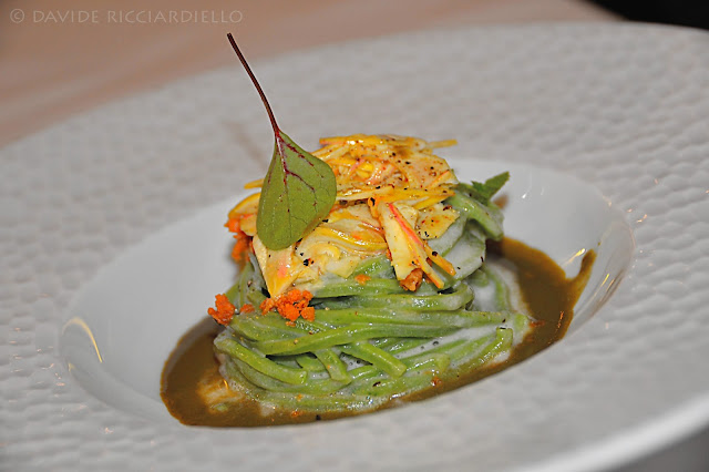 Chitarrina alla clorofilla di prezzemolo, carciofo alla brace liquido, bottarga di tonno rosso